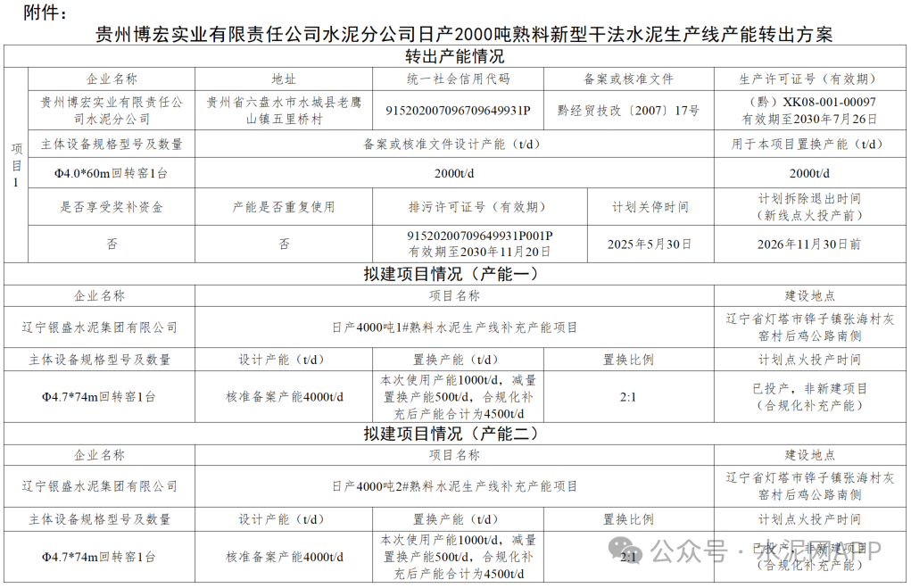 置換方案顯示,貴州博宏實業(yè)水泥公司退出一條2000t/d熟料生產(chǎn)線,產(chǎn)能用于補(bǔ)充遼寧銀盛水泥兩條4000t/d熟料生產(chǎn)線。
