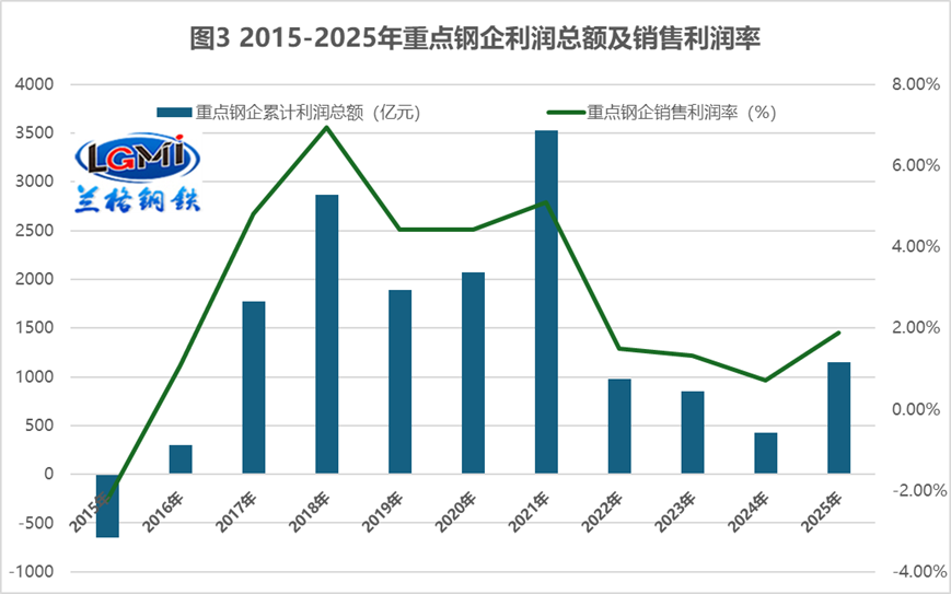 從盈利能力來(lái)看,2025年重點(diǎn)鋼鐵企業(yè)盈利水平實(shí)現(xiàn)實(shí)質(zhì)性改善,噸鋼盈利達(dá)到143元,較上年同期增加91元,不僅一舉扭轉(zhuǎn)了此前盈利低迷的局面,還較鋼鐵行業(yè)整體噸鋼盈利高出29元,彰顯出重點(diǎn)鋼企在成本控制與產(chǎn)品溢價(jià)方面的核心優(yōu)勢(shì)(詳見(jiàn)圖 2)。從盈利效率來(lái)看,2025年重點(diǎn)鋼鐵企業(yè)成本利潤(rùn)率為2.02%,較上年上升1.27個(gè)百分點(diǎn);銷(xiāo)售利潤(rùn)率為1.89%,較上年上升1.18個(gè)百分點(diǎn)(詳見(jiàn)圖 3),兩大利潤(rùn)率指標(biāo)的同步回升,標(biāo)志著企業(yè)經(jīng)營(yíng)質(zhì)量的穩(wěn)步提升,盈利的可持續(xù)性顯著增強(qiáng)。